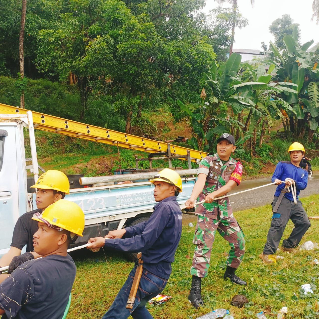 Bone – Babinsa Koramil 1407-18/Kajuara, Kopda Andi Fachruddin dampingi petugas teknis dari Perusahaan Listrik Negara (PLN) dalam pemeliharaan jaringan kabel listrik di Desa Mallahae,…