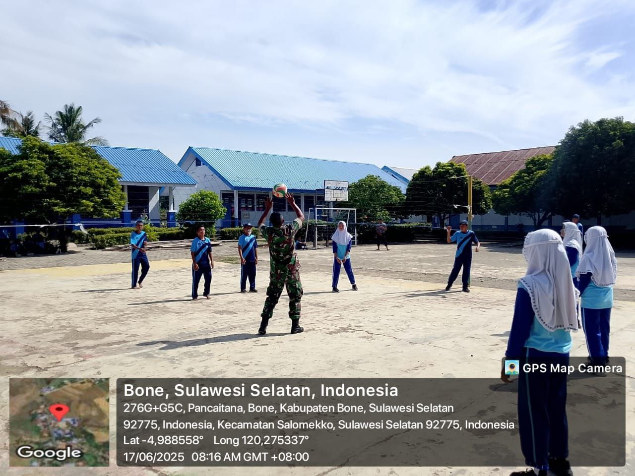 Bone – Bangun semangat kebersamaan dengan generasi muda, Babinsa Koramil 1407-17/Salomekko, Sertu Abdul Lati laksanakan olahraga bola voli bersama siswa-siswi SMP Negeri 1 Kel….