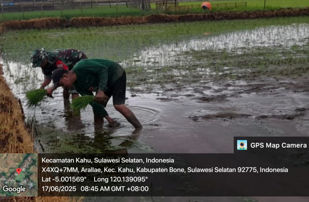 Bone – Babinsa Koramil 1407-19/Kahu, Kodim 1407/Bone, Serda Muh. Nasrun, turun langsung mendampingi warga binaan dalam kegiatan penanaman bibit padi di area persawahan Desa…
