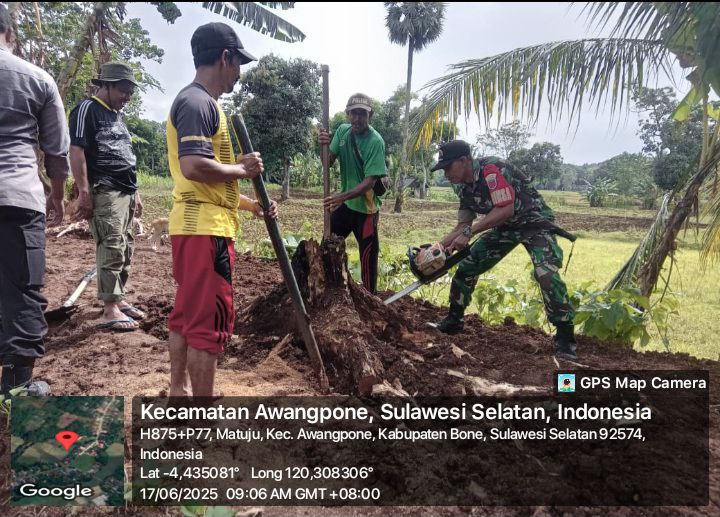 BONE – Babinsa Koramil 1407-06/Awangpone Serka Jamaluddin melaksanakan kegiatan karya bakti bersama warga dengan sasaran perintisan jalan tani di Desa Matuju, Kecamatan Awangpone, Kabupaten…