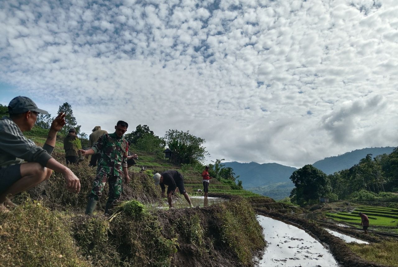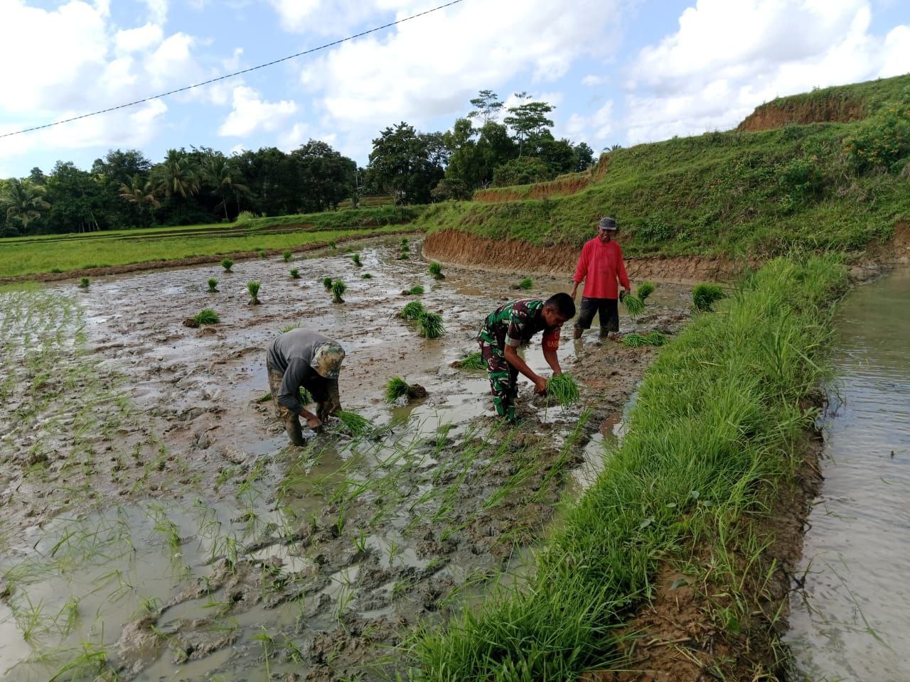 Bone – Anggota Koramil 1407-08/Lamuru Serda Sandy Paputungan, bersama warga melaksanakan tanam padi di lahan persawahan milik Pak Tawil, yang terletak di Larompei, Dusun…