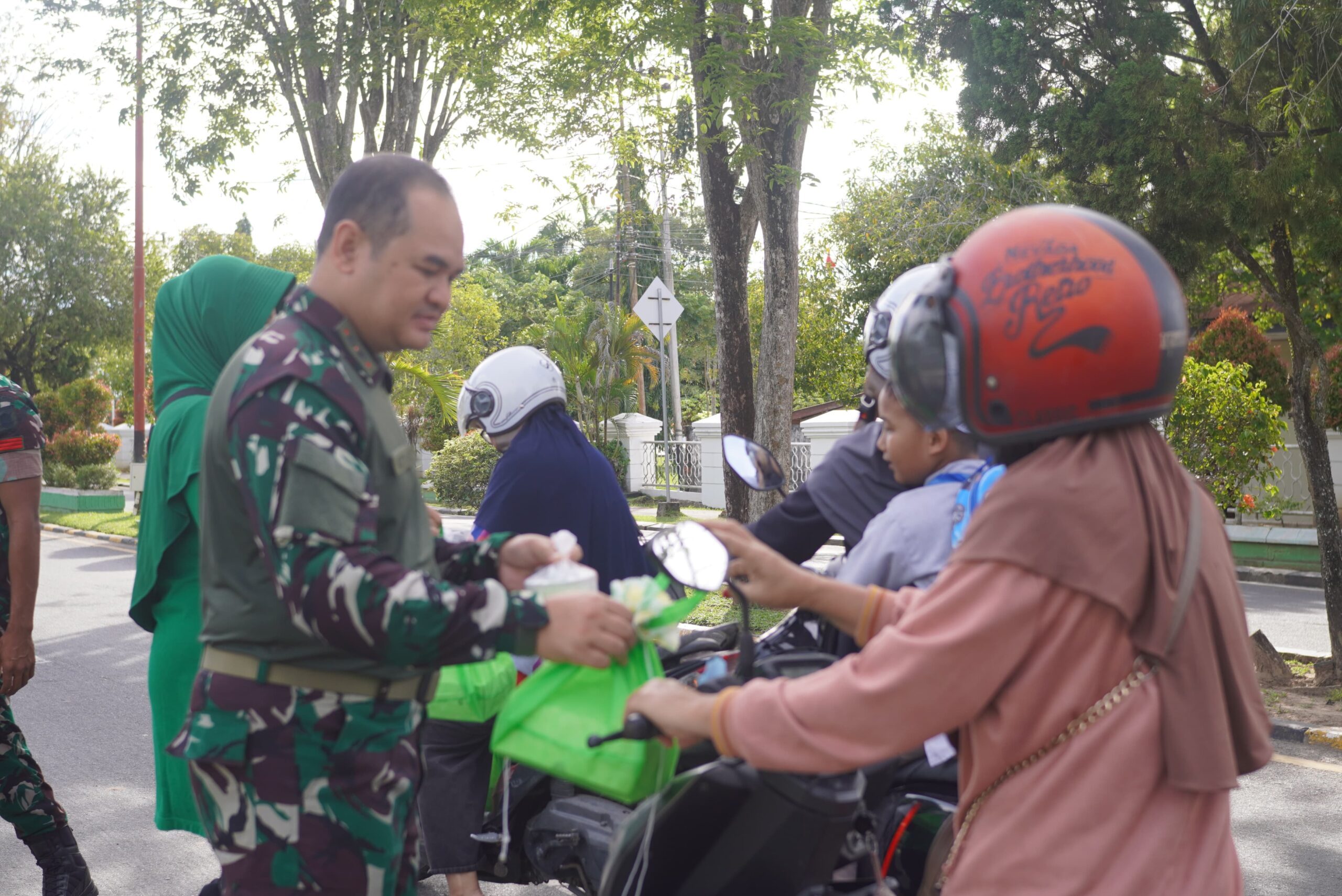 Pinrang_ Danramil-07/Lembang Lettu Inf Muharram bersama anggotanya dan ibu-ibu Persit melaksanakan berbagi makanan berupa nasi kotak Kepada warga masyarakat pengguna jalan yang sedang melintas…