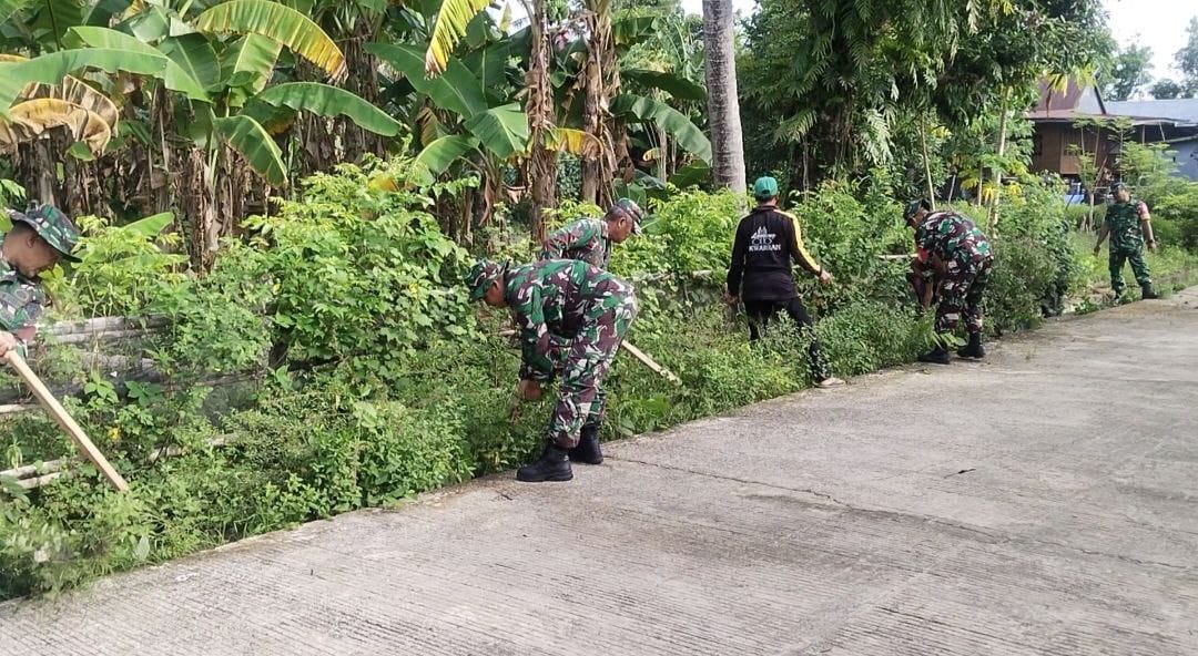 BONE – Sertu Ansar Rajab Babinsa Koramil 1407-16/Tonra bersama warga binaan melaksanakan kerja bakti atau gotong royong pembersihan kanan kiri jalan di Dusun Gariccing…