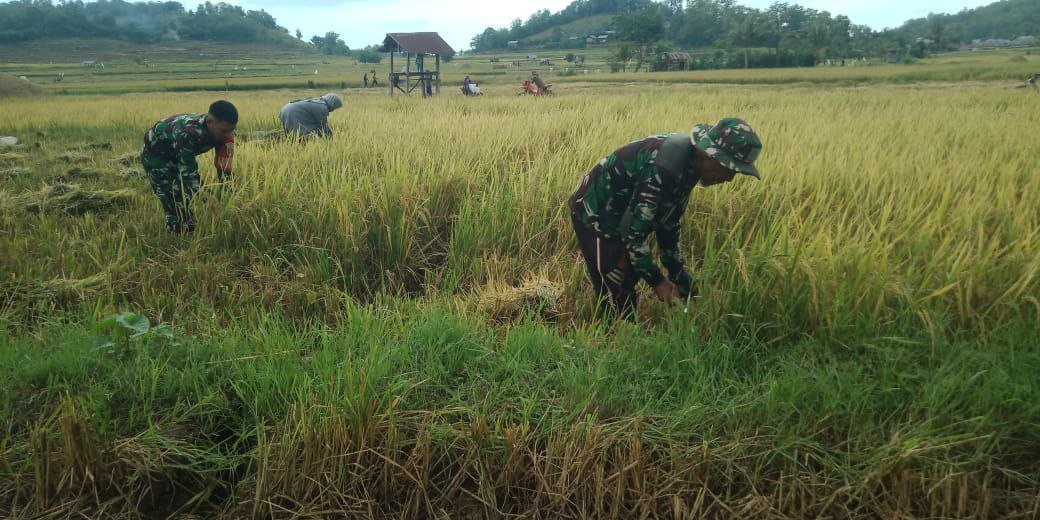 BONE – Upaya mendorong kesejahteraan petani, Babinsa Koramil 16/Tonra Kodim 1407/Bone Kopda Ahmad bantu petani padi saat memanen padi di Desa Muara, Kecamatan Tonra,…