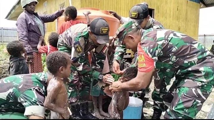 Tigi, – Koramil 1703-02/Tigi. Babinsa Serka Suherma dan Serda Oktovianus Bersama Anggota Satgas 527/Braja Yudha. Ajarkan Kepada Anak – anak Papua Pengetahuan tentang pola…
