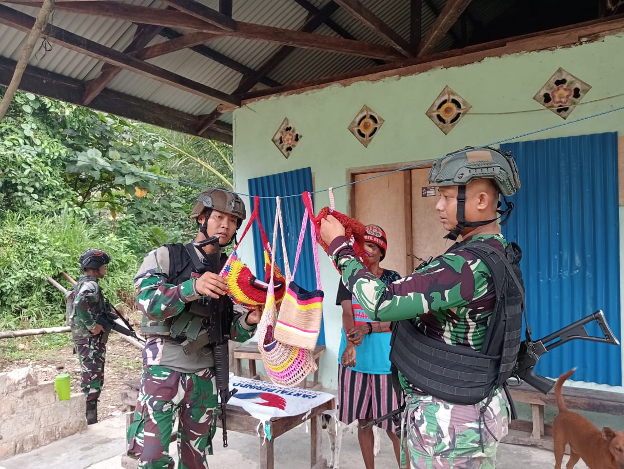 Maybrat_Dalam rangka mendukung kegiatan ekonomi kreatif yang digalakan oleh pemerintah, Satgas Yonif 133/YS berkunjung ke salah satu pengrajin Noken di Kampung Tahsimara untuk memborong…