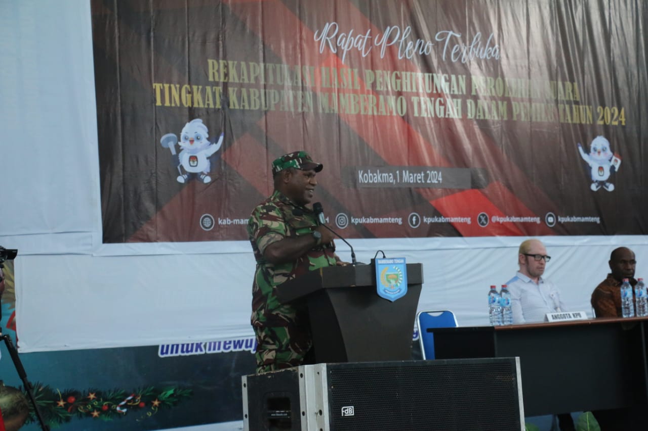 Wamena – Dandim 1702/Jayawijaya Letkol Cpn Athenius Murip, S.H., M.H., turut serta menghadiri rapat pleno terbuka rekapitulasi hasil pemilihan umum tahun 2024 Kabupaten Mamberamo…
