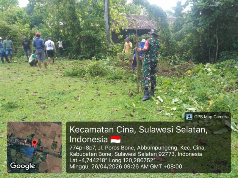 BONE – Babinsa Koramil 1407-12/Cina Koptu Sham Nur melaksanakan kegiatan karya bakti bersama warga Desa Abbumpungen, Kecamatan Cina, Kabupaten Bone. Minggu siang (26/04/26).