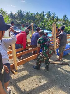 Kajuara – Personel Koramil 1407-18/Kajuara bersama warga Desa Polewali membuat jembatan penyeberangan darurat penghubung antar Kelurahan Awang Tangka, dan Desa Polewali, Kecamatan Kajuara, Minggu (21/08/2022)