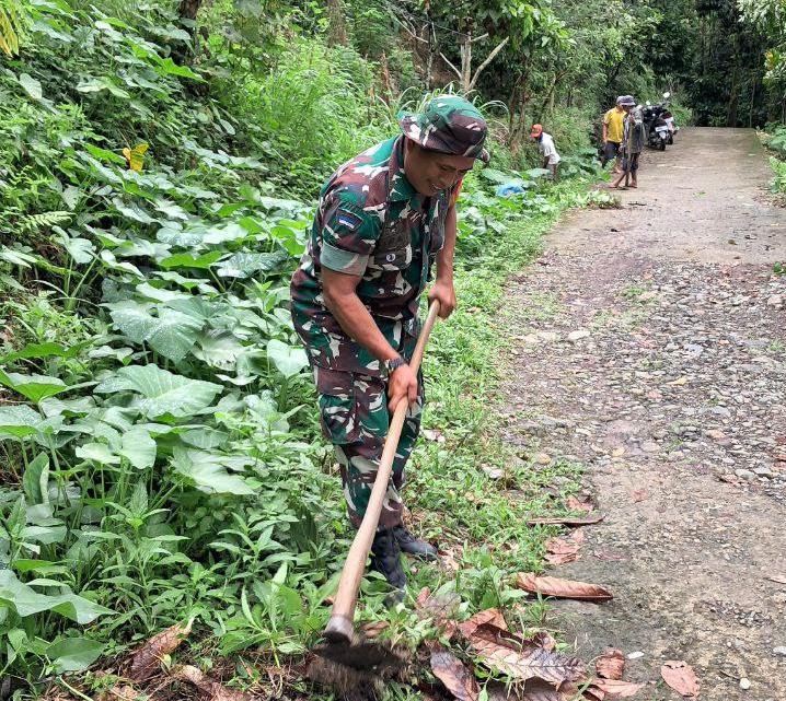 Sertu Rifai menyampaikan “Pembersihan jalan ini dilaksanakan dengan membabat rumput liar yang berada di kanan dan kiri jalan dan juga tumbuhan yang menutupi jalan, sehingga jalan terlihat bersih. Diharapkan ke depannya sinegritas TNI dan aparat pemerintah daerah terus terjalin dan selalu bekerjasama menjaga masyarakat dan juga peduli pada kebersihan lingkungan”.