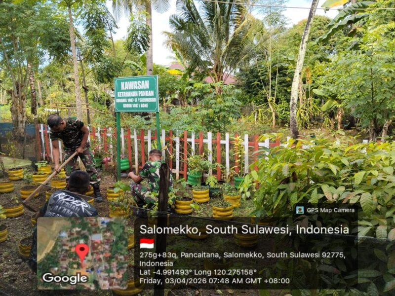BONE – Anggota Koramil 1407-17/Salomekko melaksanakan pembersihan pangkalan, yang dilaksanakan di kebun Hanpangan Koramil, Kec. Salomekko, Kab. Bone. Jumat siang (03/04/26).