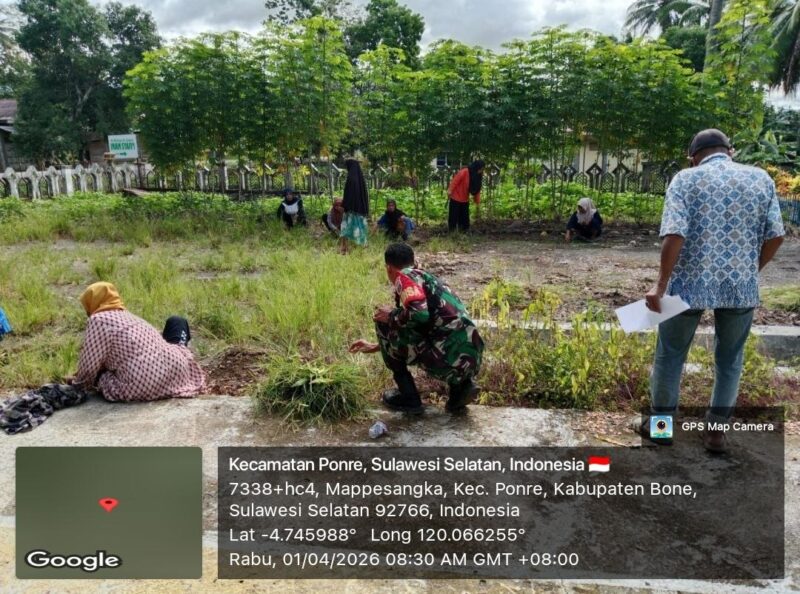 BONE – Serka Darwan Sanusi, Babinsa Koramil 1407-10/Ponre, melaksanakan kegiatan kerja bakti bersama perangkat desa di halaman Kantor Desa Mappesangka, Kecamatan Ponre, Kabupaten Bone, Rabu siang (01/04/26).
