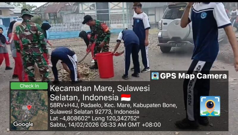 Bone – Anggota Koramil 15/Mare Kodim 1407/Bone bersama siswa Sekolah SMA Neg 2 Bone melaksanakan Karya Bakti pembersihan sampah di kiri kanan jalan Kelurahan Padaelo, Kecamatan Mare, Kabupaten Bone. Sabtu Siang (14/02/2026).