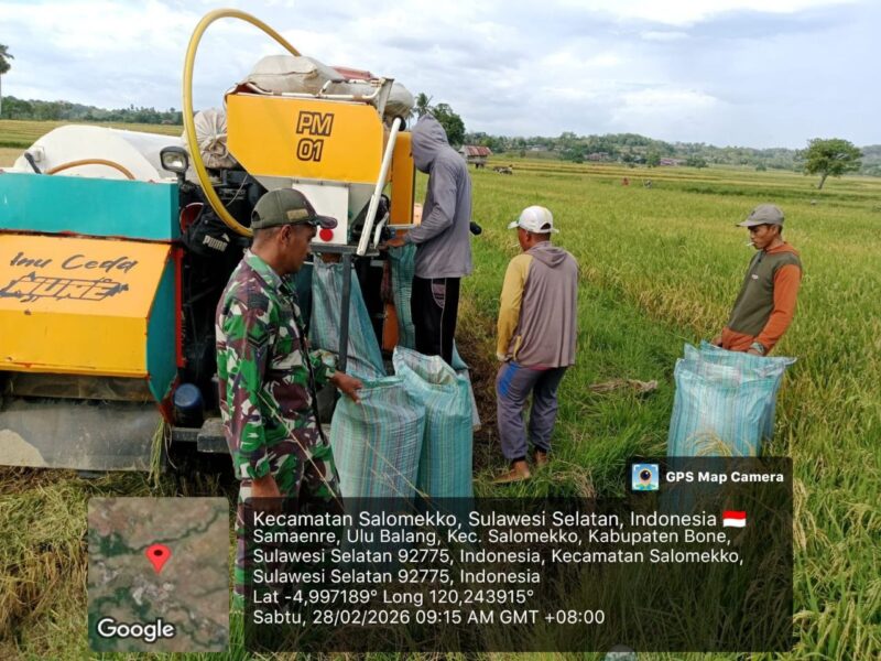 BONE – Babinsa Koramil 1407-17/Salomekko Sertu Herman melaksanakan pendampingan ketahanan pangan dengan membantu panen padi milik warga di Desa Ulubalang, Kec. Salomekko, Kab. Bone. Sabtu siang (28/02/26).